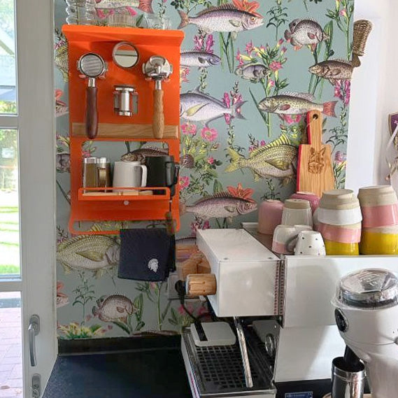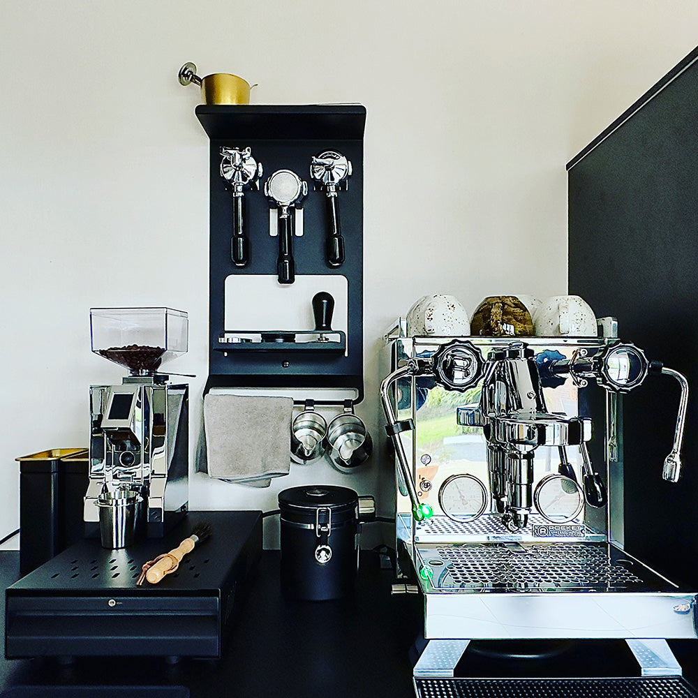 Scopri il FLATE® Barista Rack: il tuo scaffale per macchine da caffè espresso, pressino e accessori per il caffè. Questo scaffale per caffè di alta qualità è il compagno perfetto per la tua routine quotidiana del caffè, mette ordine nel tuo angolo caffè e libera spazio sul tuo piano di lavoro. È realizzato in acciaio verniciato a polvere e può essere montato a parete. Con tre supporti per macchine da caffè espresso o pressini, un dispositivo di sospensione per i panni da barista e due ripiani per ulteriori accessori, hai tutto il necessario per organizzare il tuo angolo caffè. È compatibile con tutti i modelli di macchine da caffè espresso comuni, come tutte le macchine E61, Sage, De'Longhi, Bezzera, Rocket e molti altri.