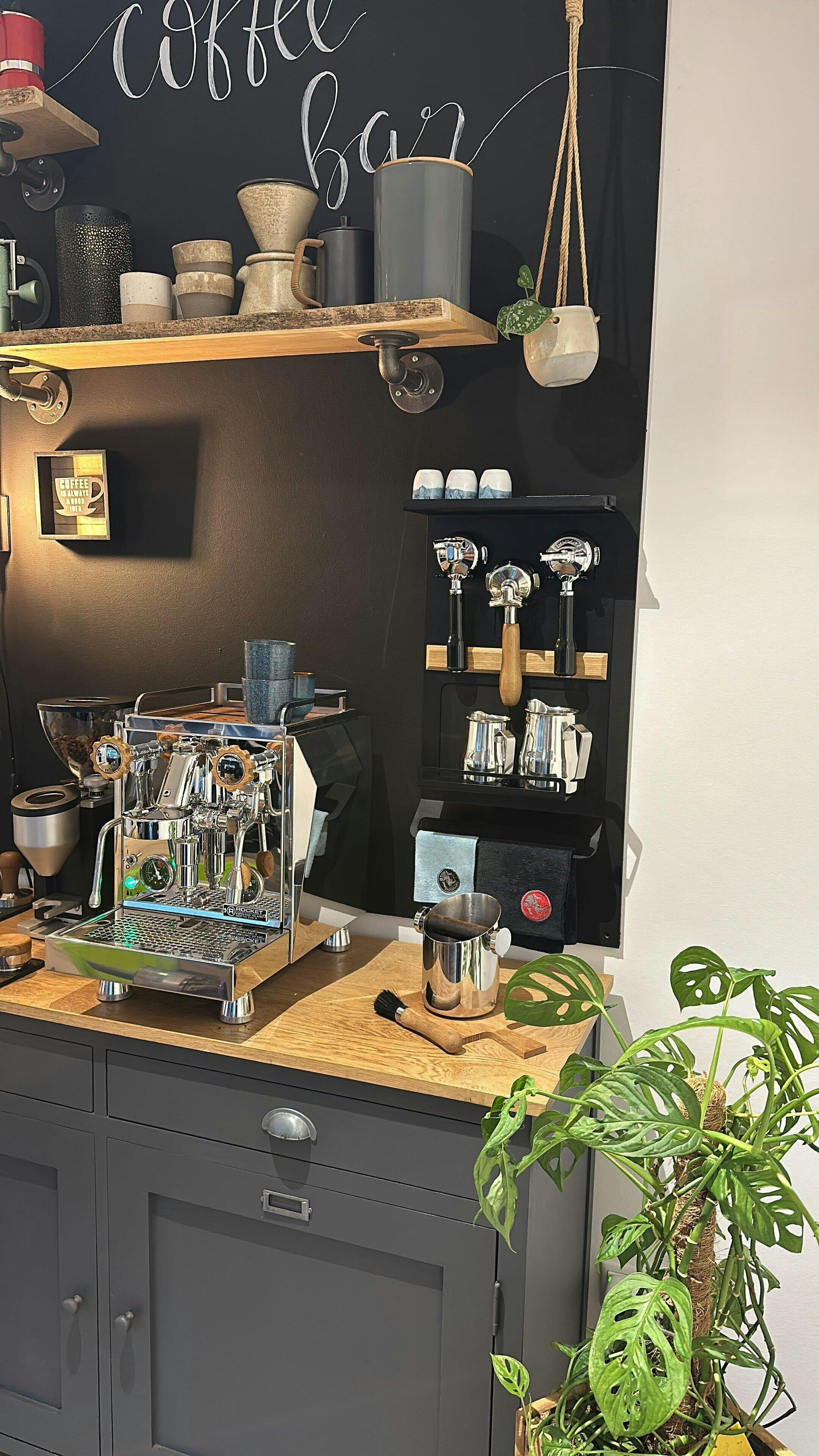 Your shelf for portafilters, tampers and coffee accessories. This high-quality coffee rack is the perfect companion for your daily coffee routine, bringing order to your coffee corner and saving space on your work surface. Made from powder-coated steel, it can be mounted on the wall. With three holders for portafilters or tampers, a hanging rail for barista towels and two shelves for additional accessories, you have everything you need to organize your coffee station. It fits all common portafilter models such as all E61 machines, Sage, De'Longhi, Bezzera, Rocket and many more.